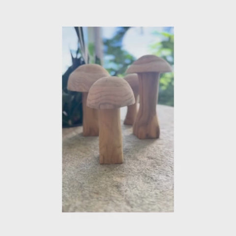 Hongos decorativos de madera reciclada teca, tallados a mano. Entre 15 y 18 cm de altura.
